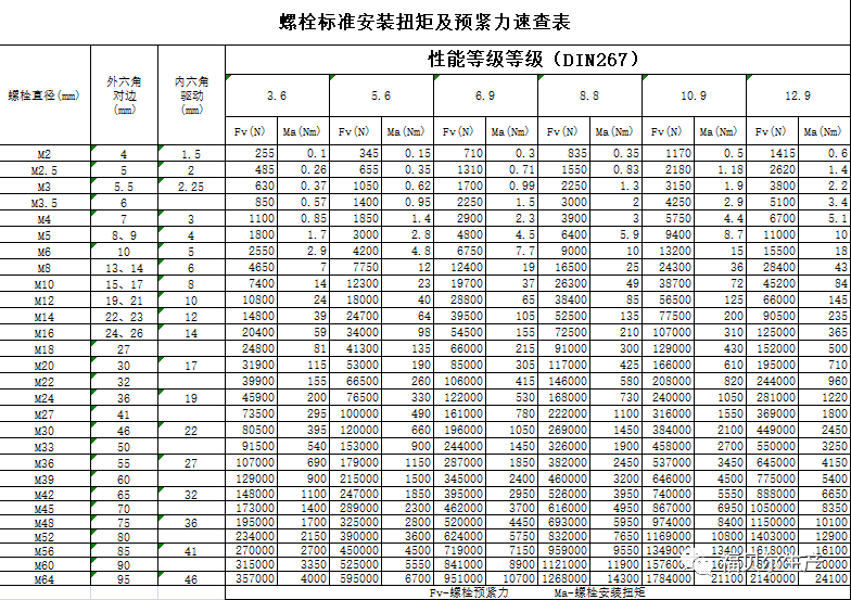 附螺栓標準安裝扭矩及預(yù)緊力速查表